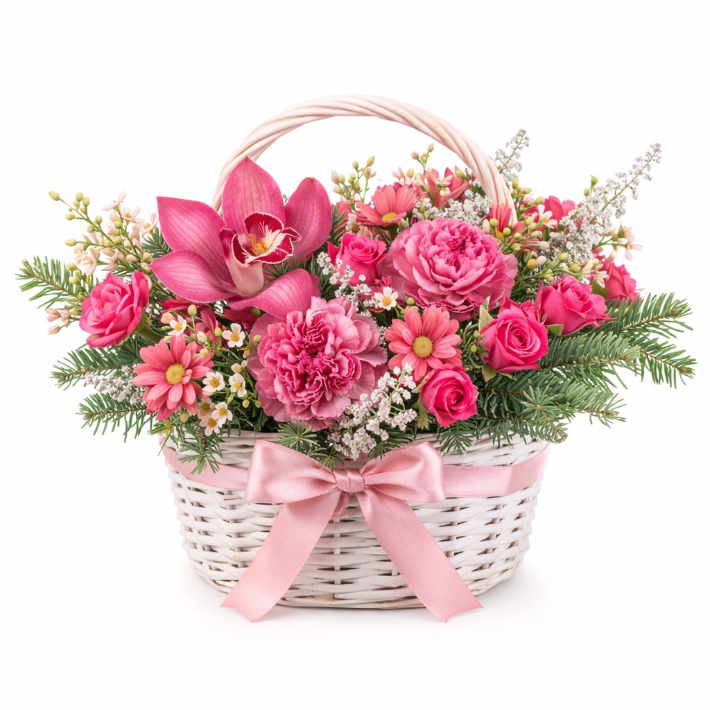 Розовая орхидея, кустовая роза и хризантема создают нежный ансамбль, дополненный гвоздикой и ваксфлауэром. Пихта придаёт композиции свежесть и объём. Белая плетёная корзина подчёркивает изящество цветов. Возможны альтернативы: корзина из лозы или ротанга. Прекрасный подарок для жены на годовщину или для мамы на день рождения.