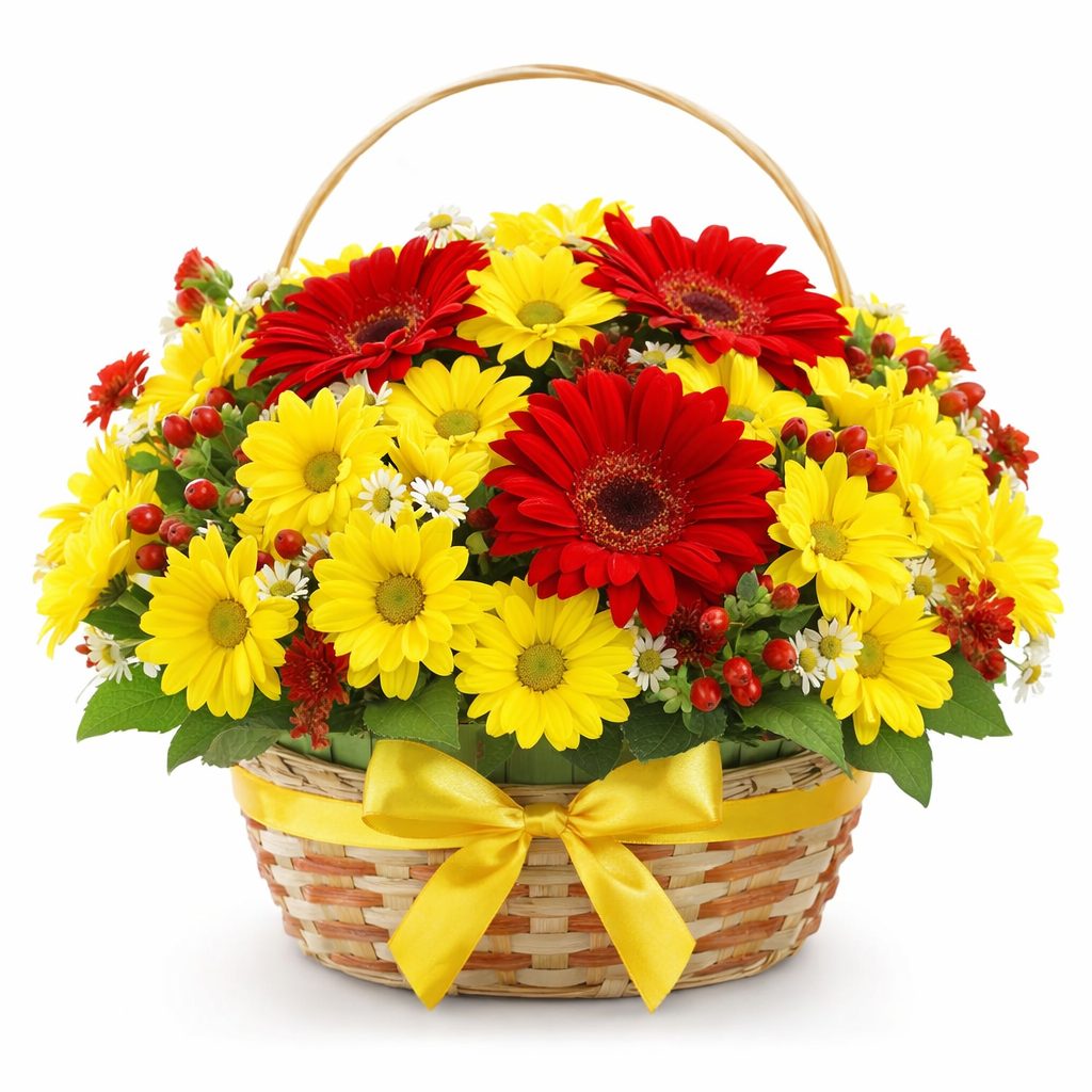 Яркая корзина с красными герберами, желтыми кустовыми хризантемами и нежными ромашками, дополненная гиперикумом и статицей, создает атмосферу радости и тепла. Плетёная корзина добавляет естественности и уюта. Возможны альтернативы оформления: корзина из лозы или корзина с тканевой отделкой. Прекрасный подарок для любимой на день рождения или годовщину.
