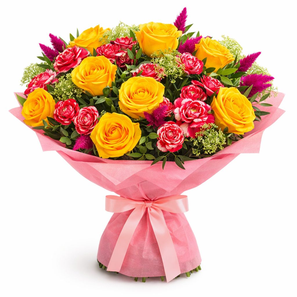 Яркие жёлтые одноголовые розы и двухцветные кустовые розы создают гармонию с фиолетовой целозией и зеленью. Букет оформлен в розовую матовую плёнку, подчёркивающую его свежесть и яркость. Возможна упаковка в крафт-бумагу или с атласной лентой. Прекрасный подарок для любимой на день рождения или годовщину.